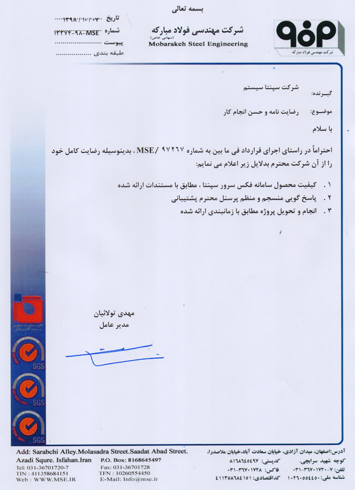 گواهی رضایت شرکت مهندسی فولاد مبارکه از سامانه فکس پیشرفته سپنتا