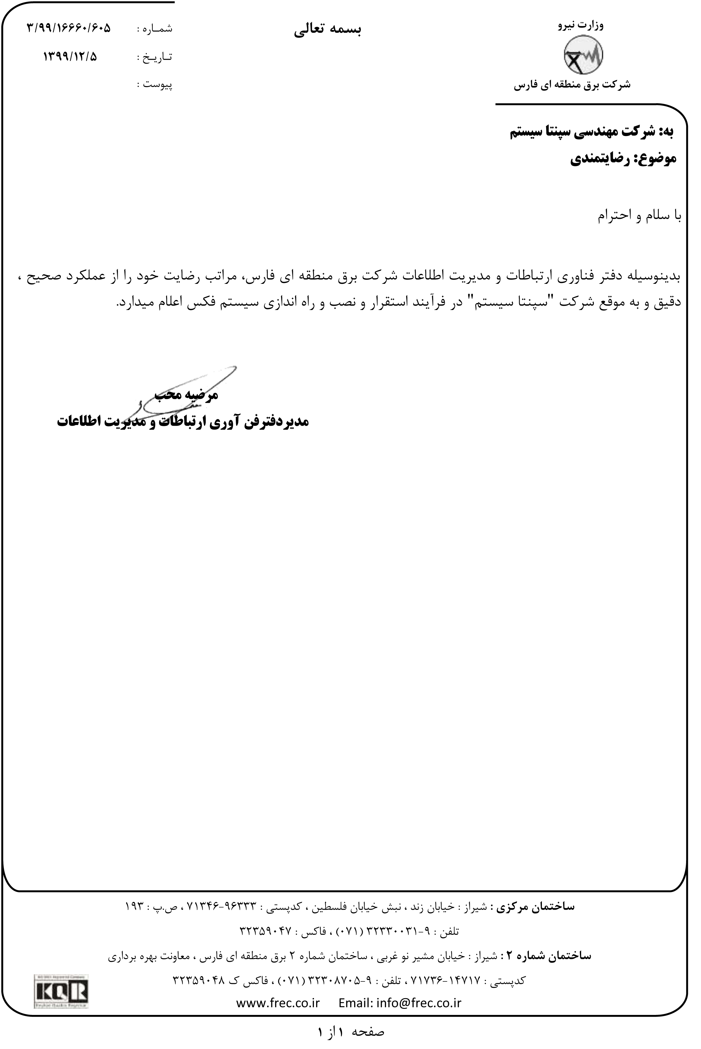 گواهی رضایت شرکت برق منطقه ای فارس از سامانه فکس پیشرفته سپنتا