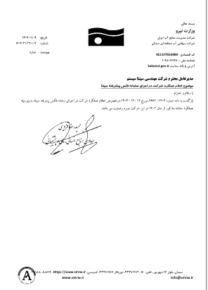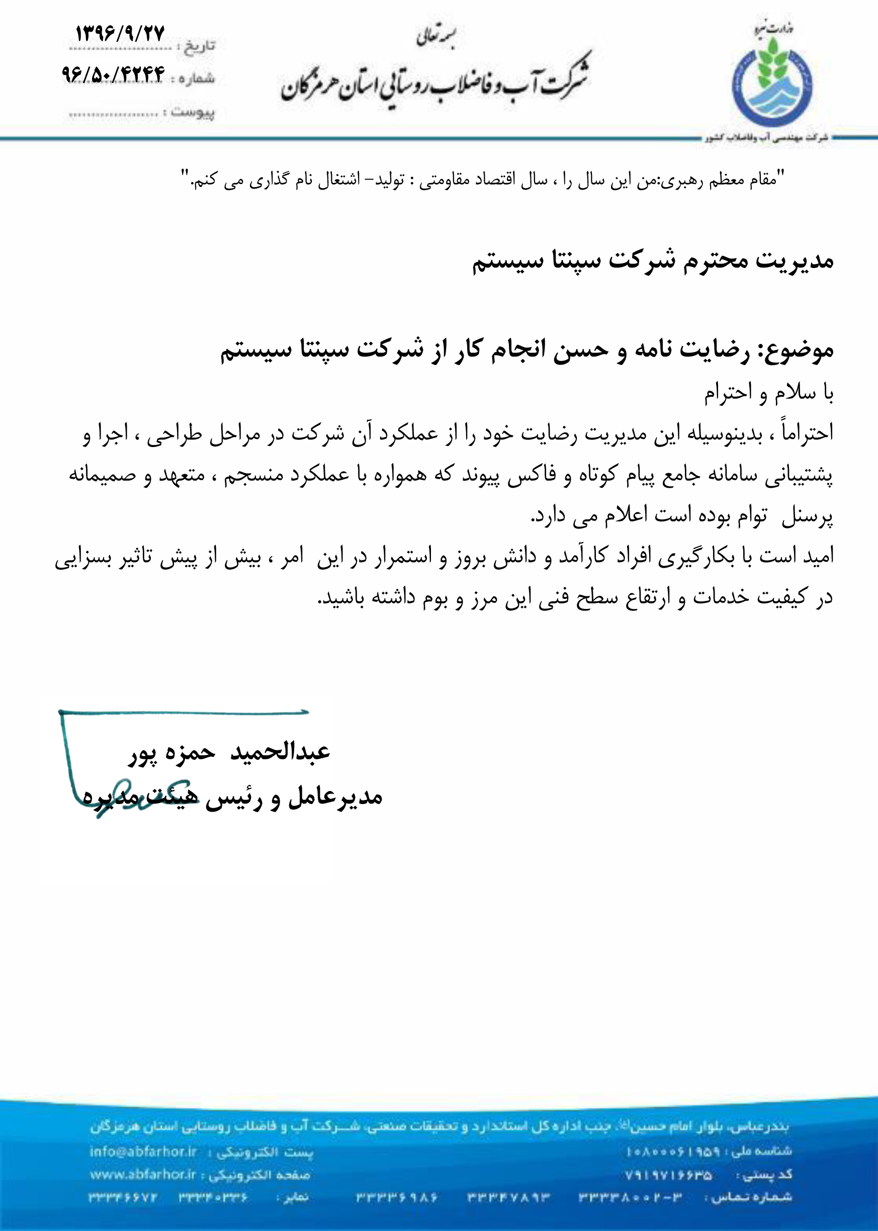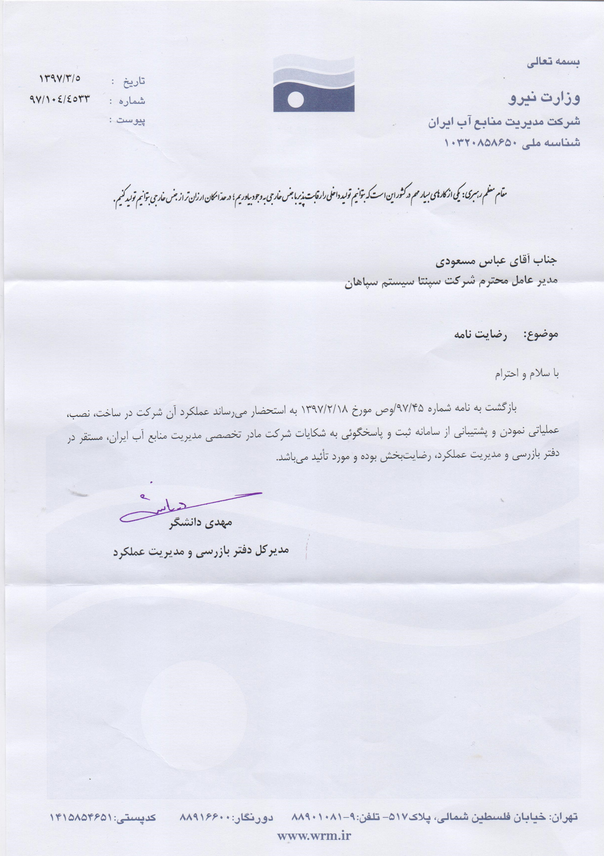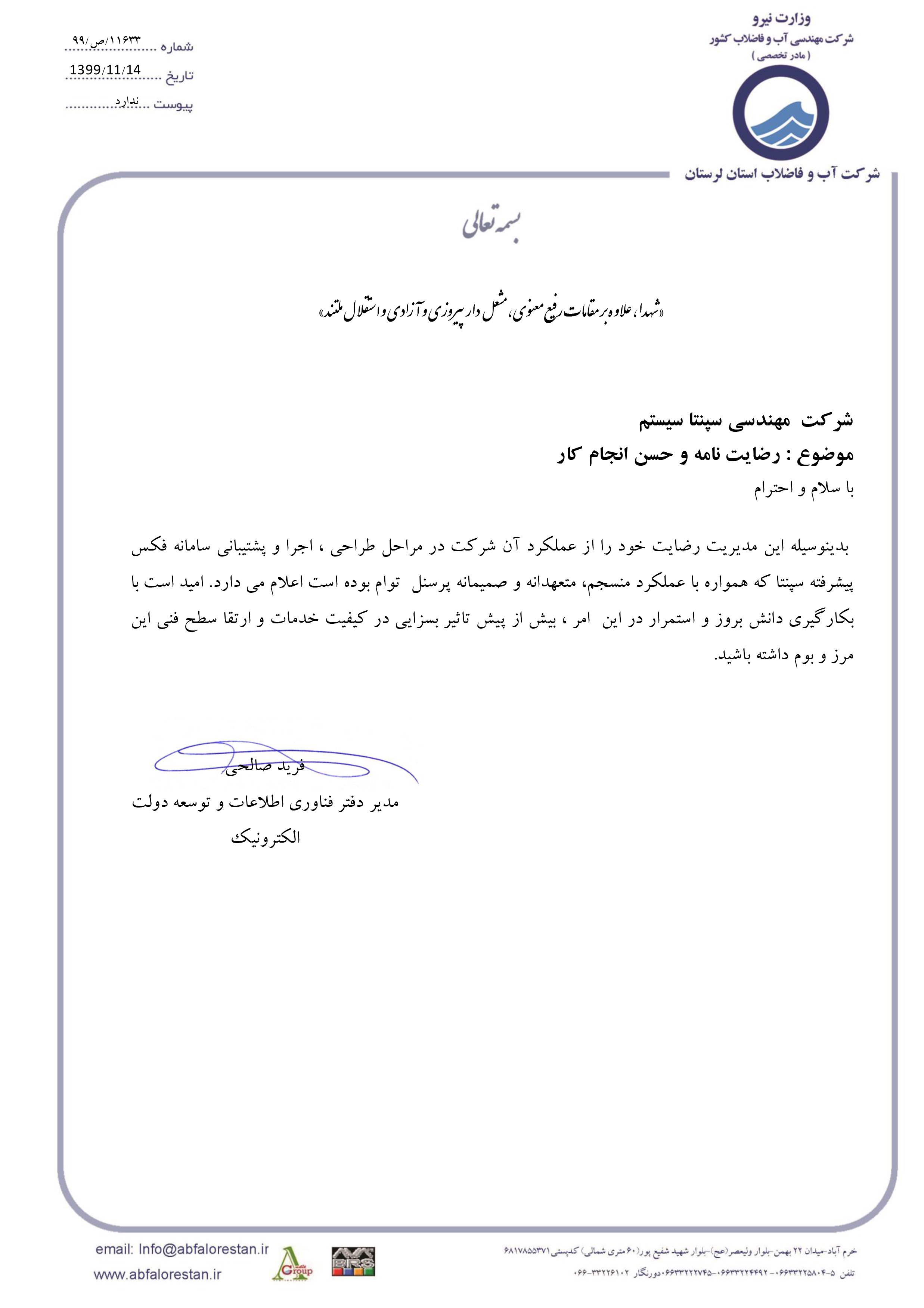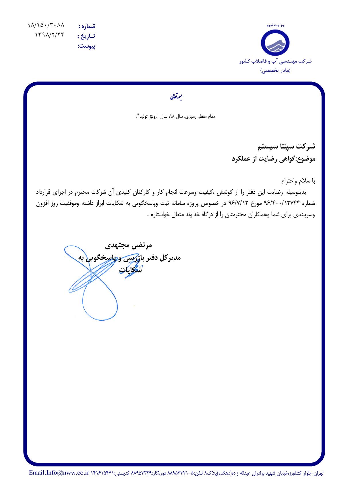 گواهی رضایت شرکت مهندسی آب و فاضلاب کشور از عملکرد شرکت سپنتا سیستم