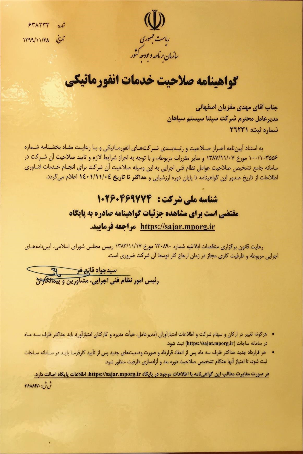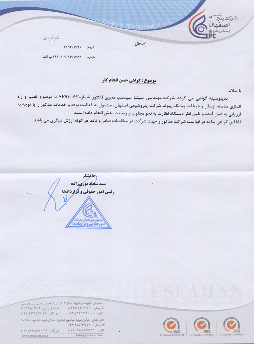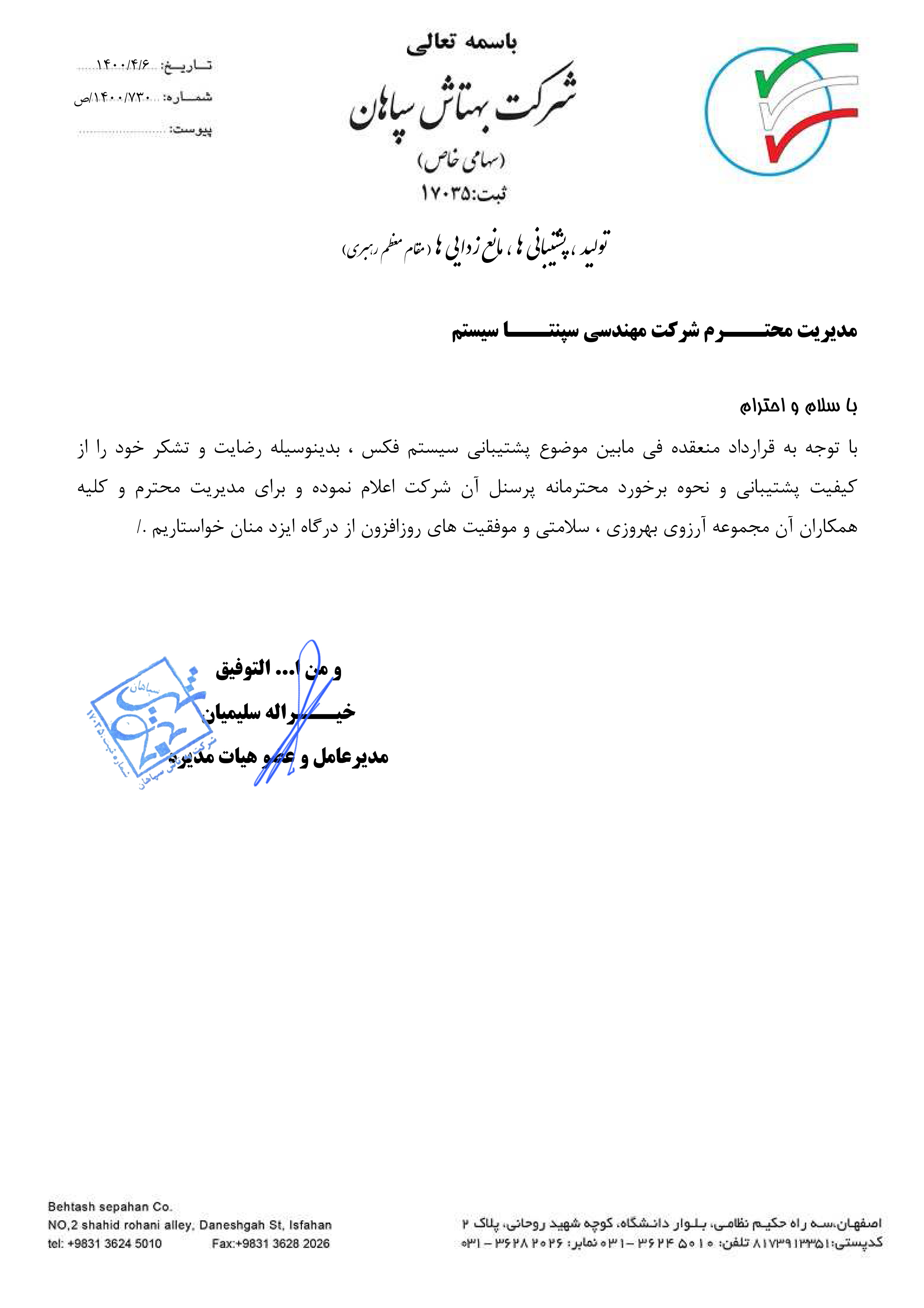 گواهی رضایت شرکت بهتاش سپاهان از محصولات و خدمات شرکت سپنتا
