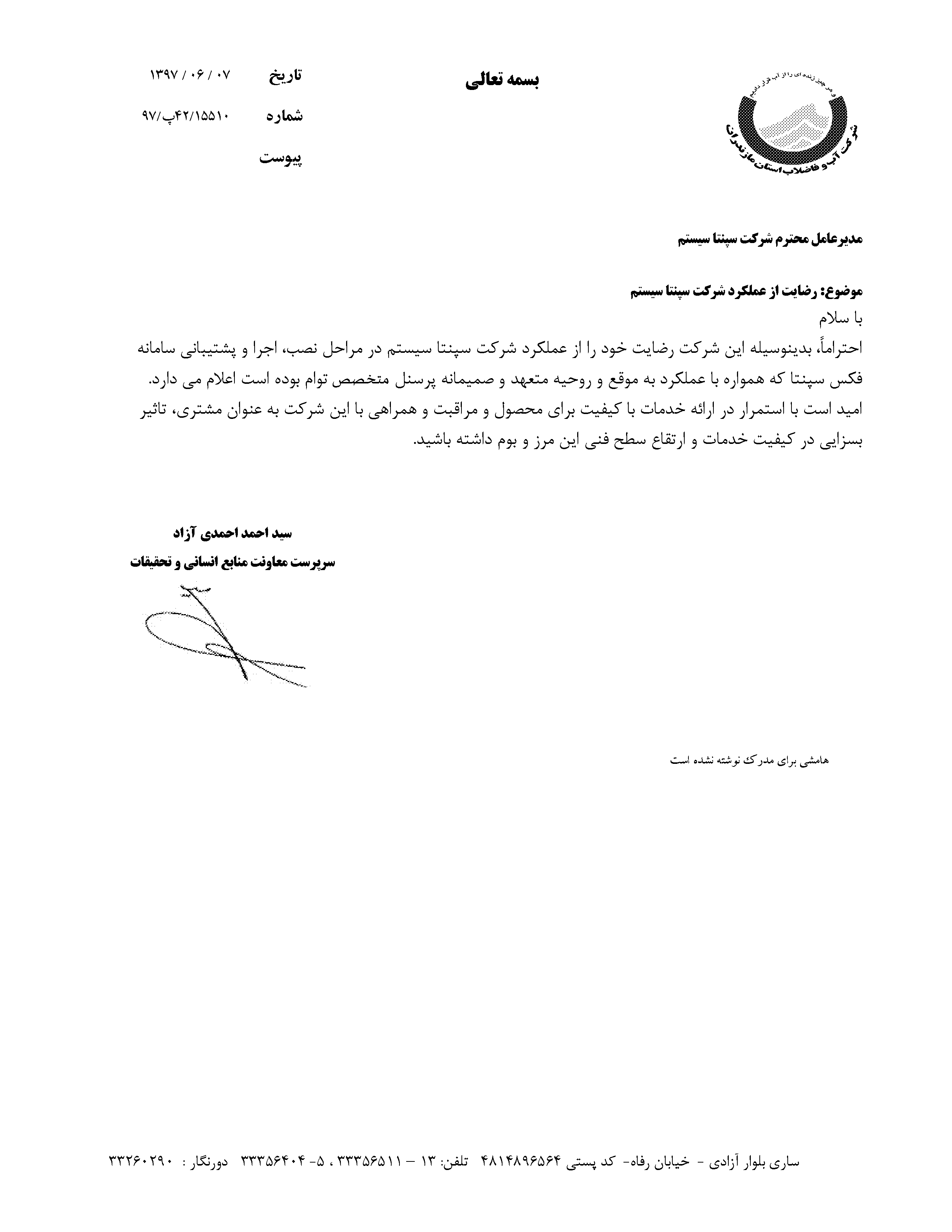 اعلام رضایت شرکت آب و فاضلاب استان مازندارن از سامانه فکس پیشرفته و شرکت سپنتا