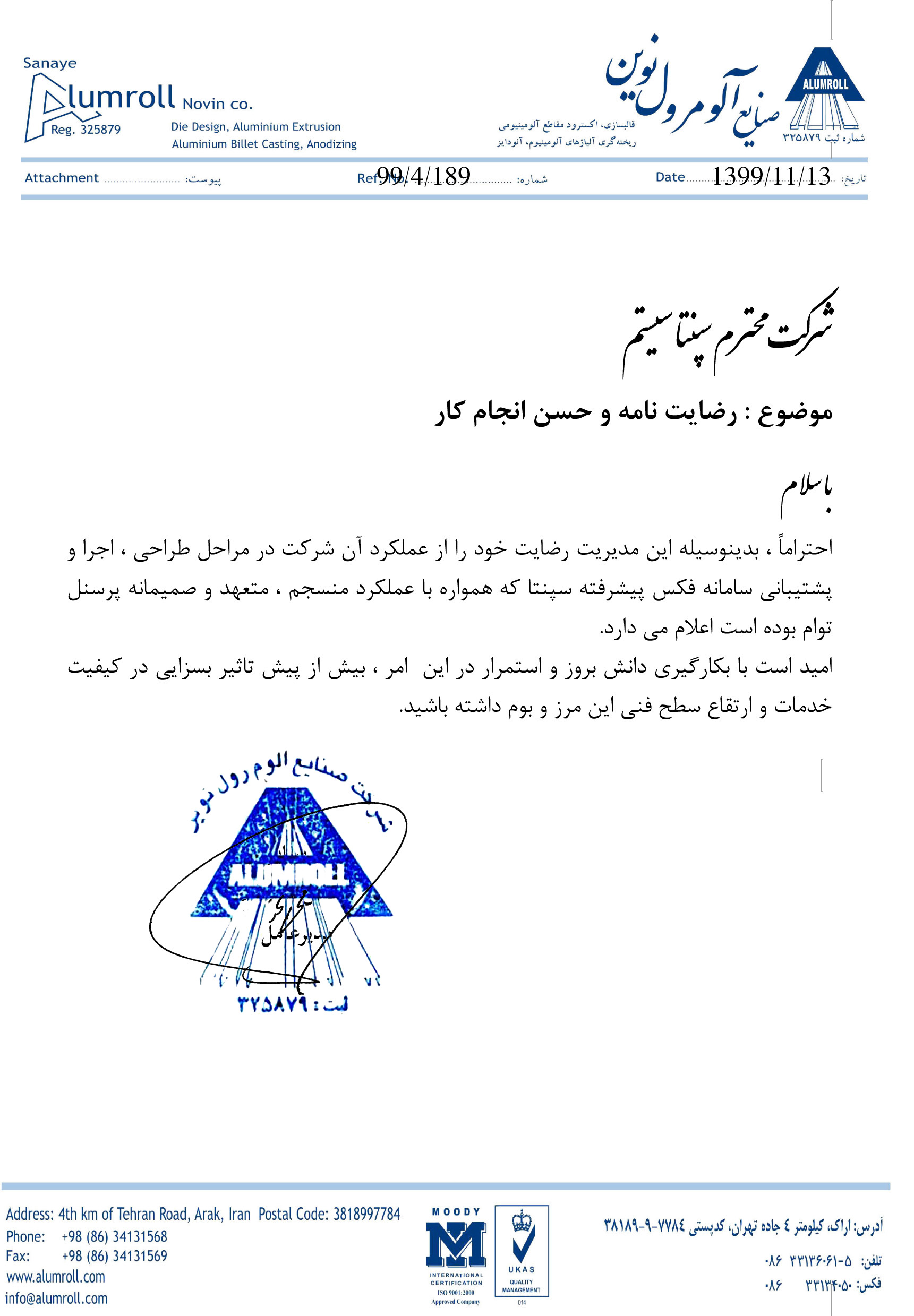 اعلام رضایت شرکت آلوم رول نوین از سامانه فکس پیشرفته سپنتا