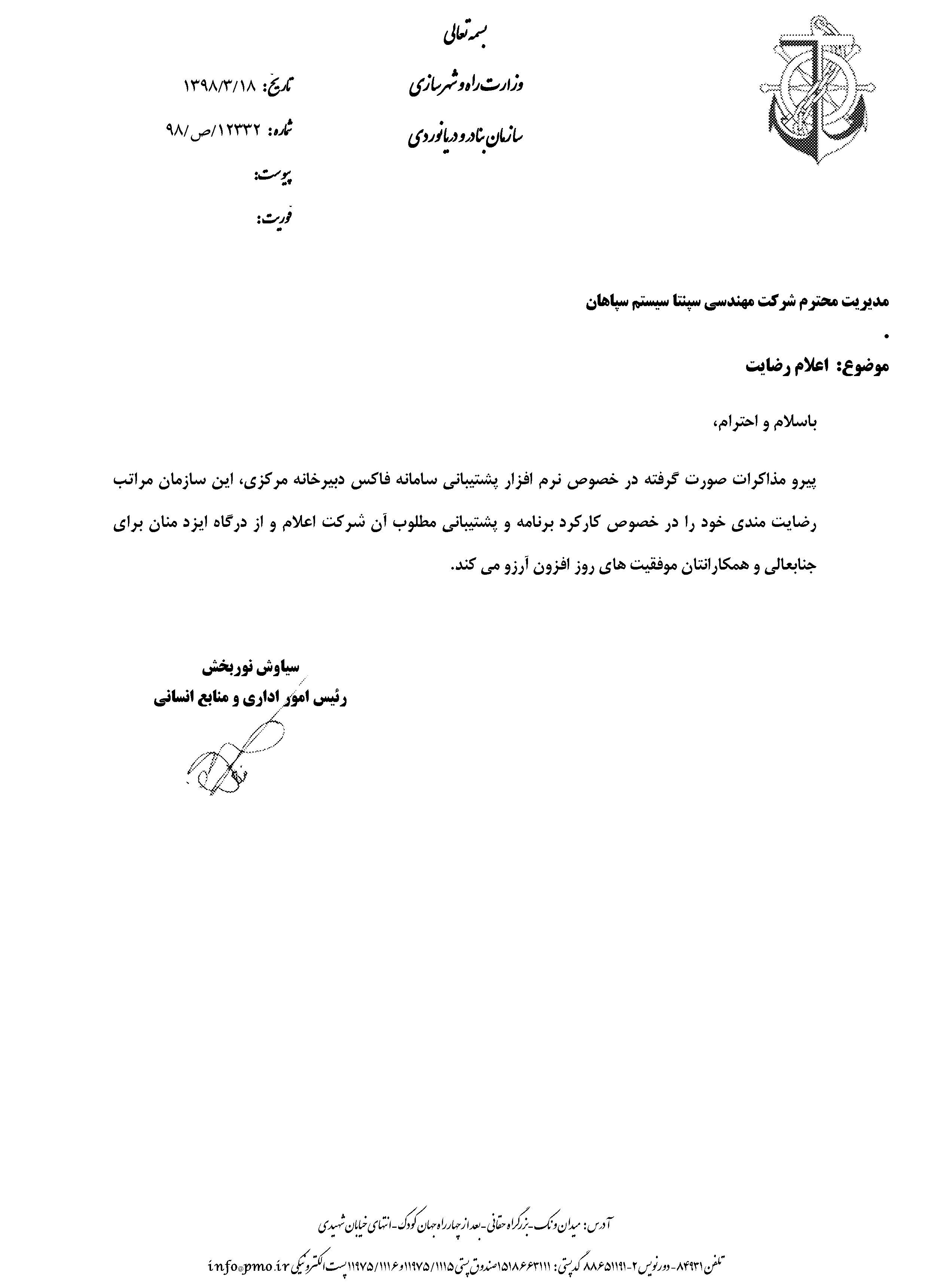 اعلام رضایت سازمان بنادر و دریانوردی کل کشور از سامانه فکس پیشرفته سپنتا
