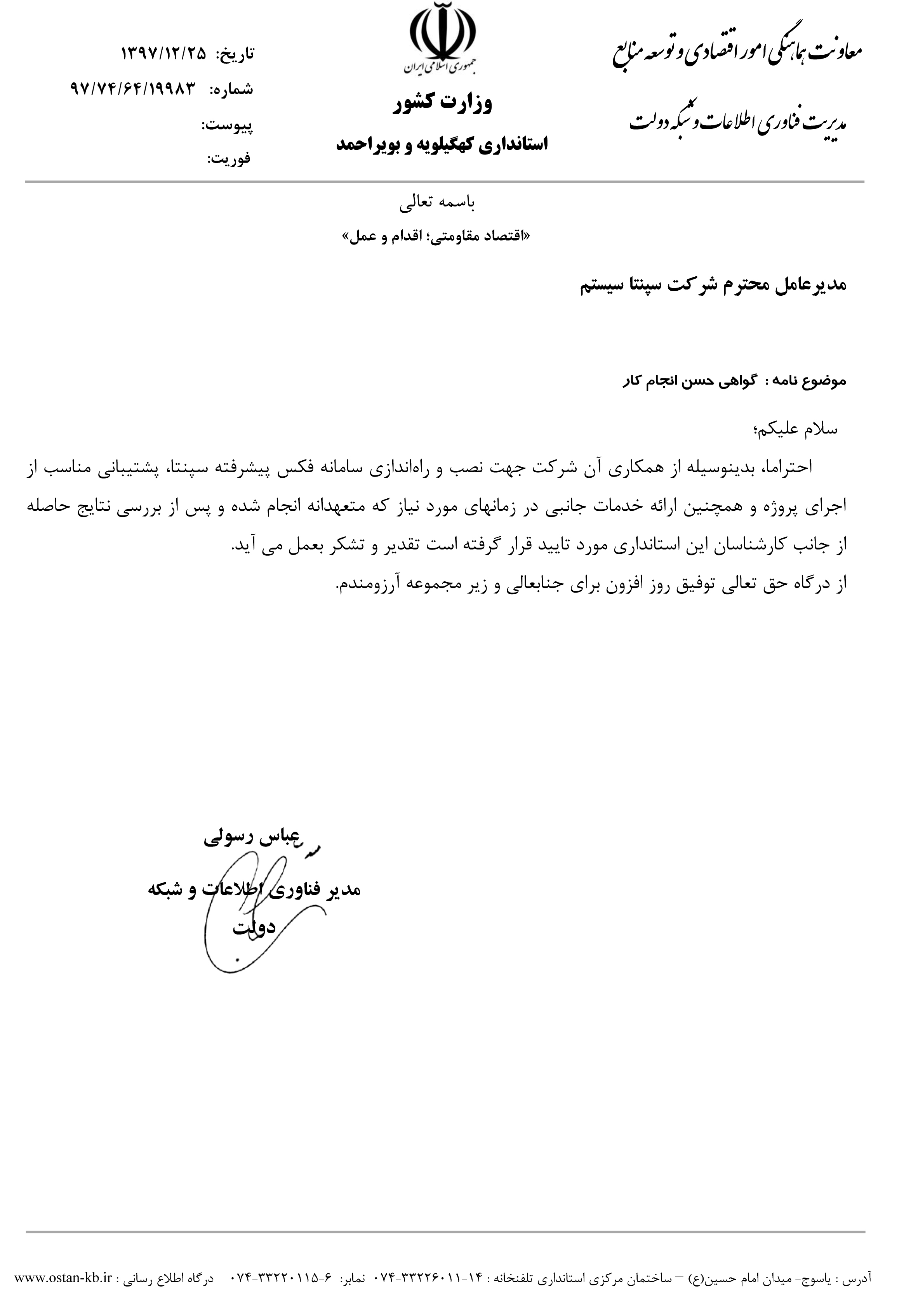 گواهی حسن انجام کار از طرف استانداری کهگیلویه و بویر احمد