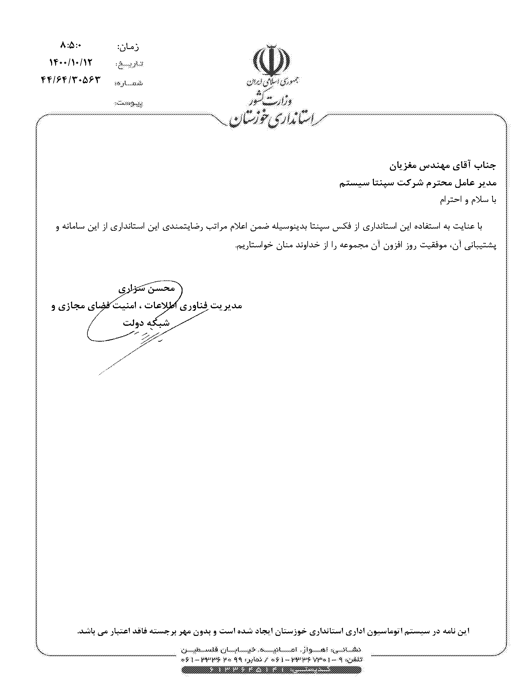 اعلام رضایت استانداری خوزستان از سامانه فکس پیشرفته و تحت وب سپنتا