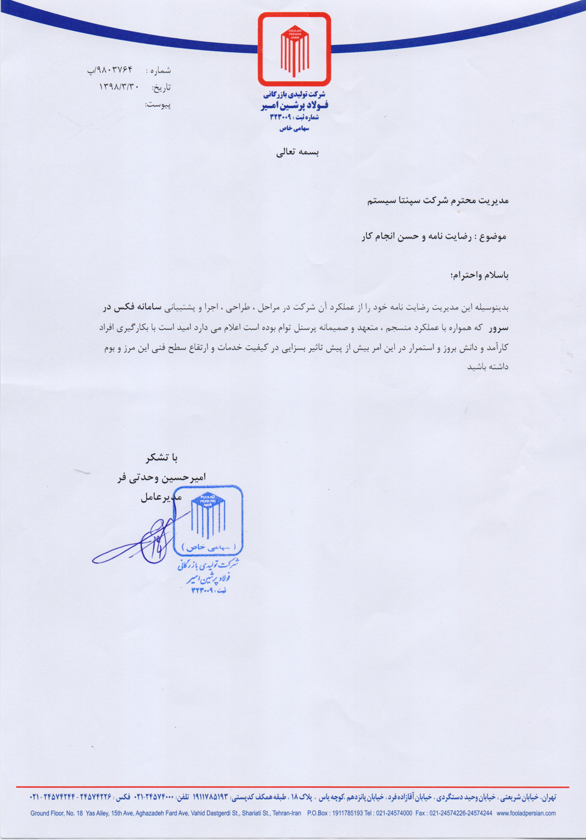 رضایت شرکت فولاد پرشین امیر از سامانه فکس پیشرفته سپنتا