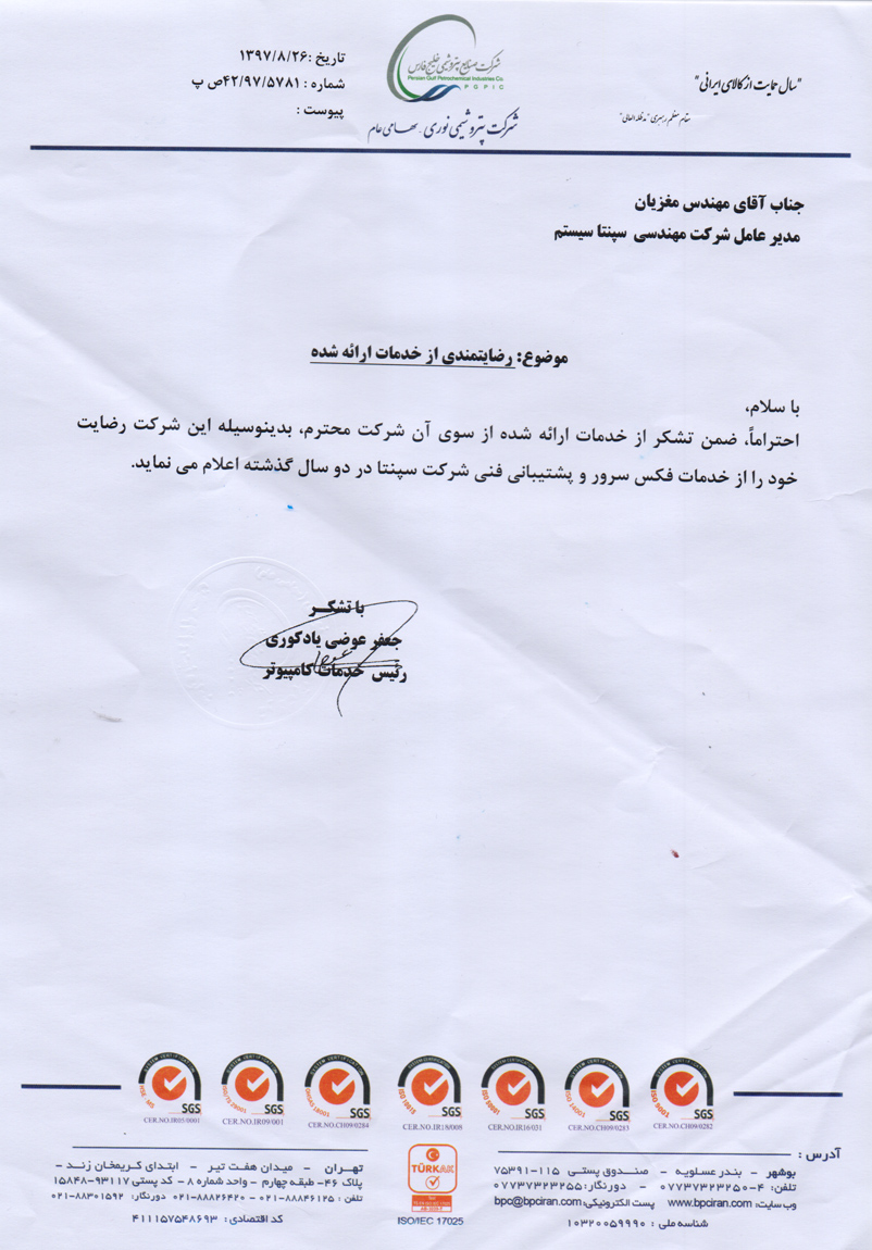 رضایت شرکت پتروشیمی نوری از فکس سپنتا و خدمات ارائه شده
