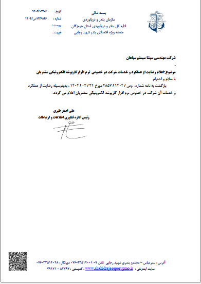اعلام رضايت اداره کل بنادر و دریانوردی هرمزگان از نرم افزار کارپوشه الکترونیک