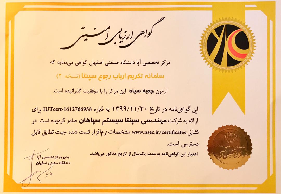 گواهی نامه ارزیابی امنیتی (آپا) سامانه جامع تکریم ارباب رجوع سپنتا - ورژن 2
