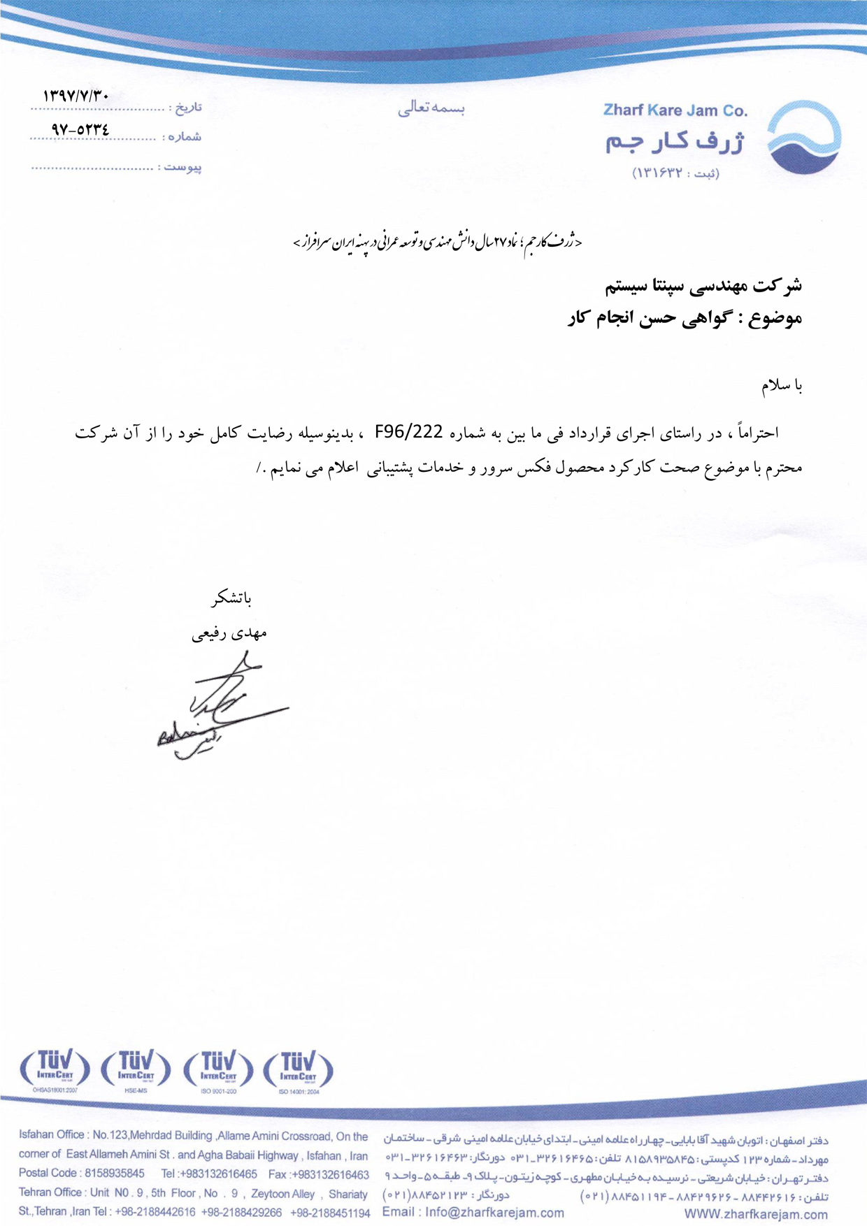 رضایت شرکت ژرف کار جم از سامانه فکس سپنتا و کیفیت پشتیبانی