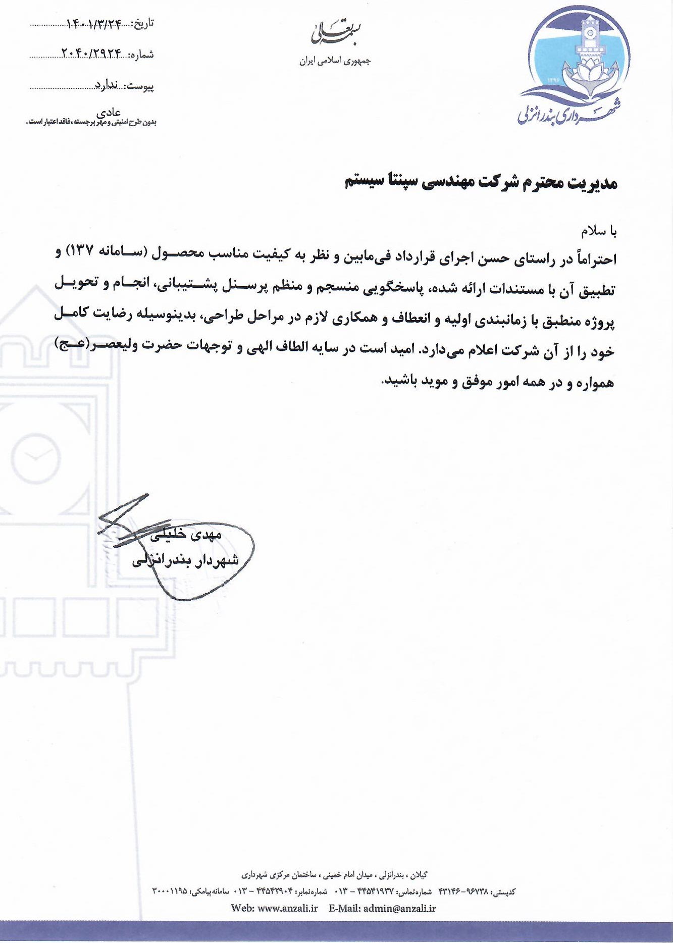 اعلام رضایت شهرداری بندر انزلی از عملکرد شرکت سپنتا و سامانه مدیریت شهری 137