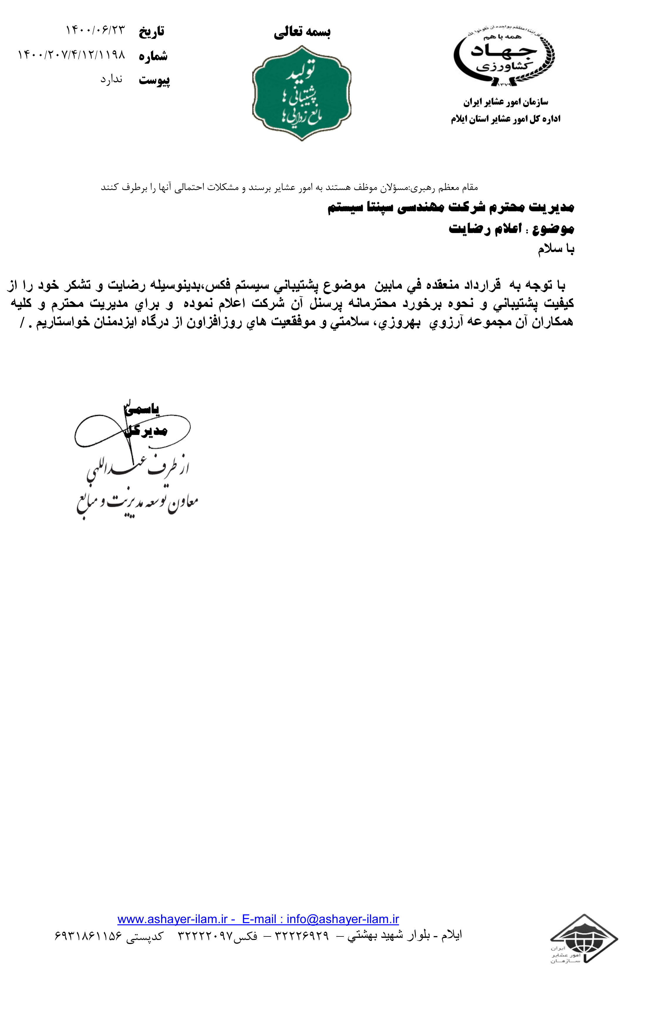 رضايت اداره کل عشایر استان ایلام از عملكرد و پشتيباني سامانه فكس پيشرفته سپنتا