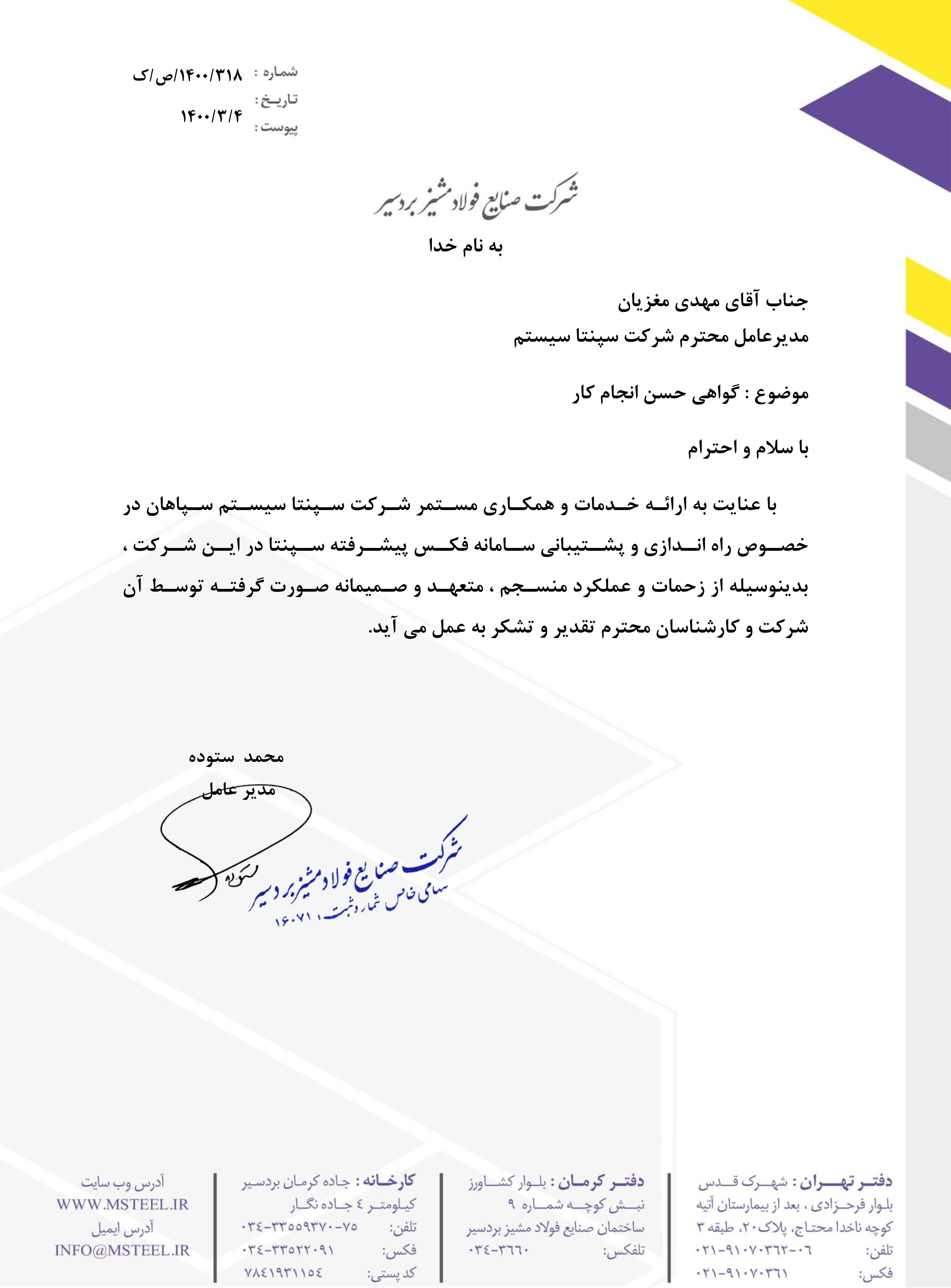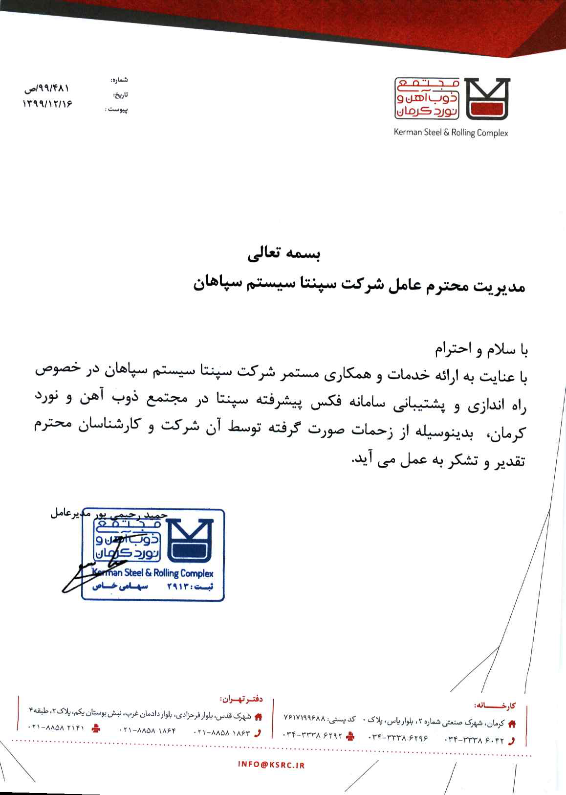 اعلام رضایت شرکت صنایع فولاد مشیز بردسیر از محصولات شرکت سپنتا