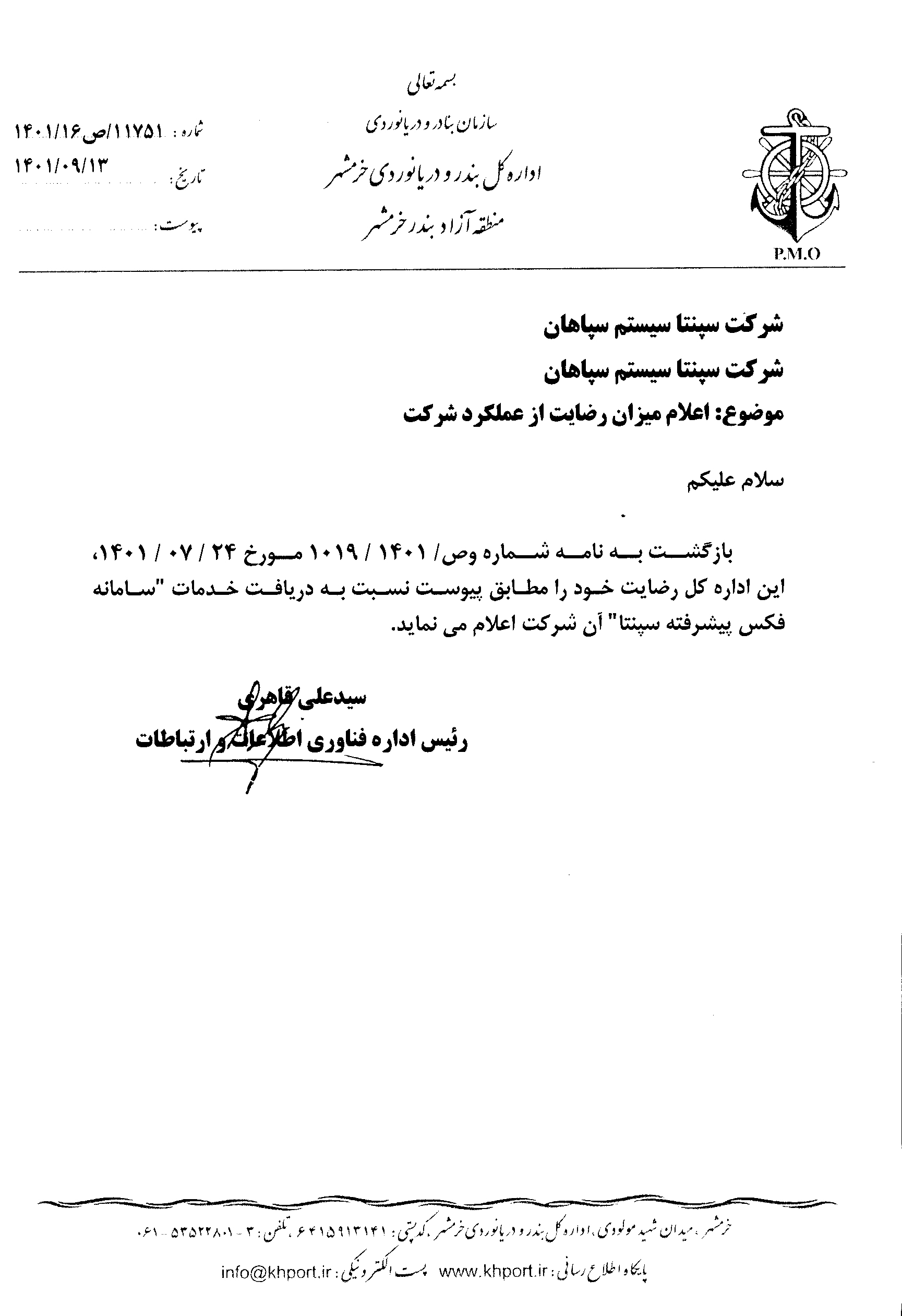اعلام رضایت اداره كل بندر ودريانوردي خرمشهراز سامانه فکس پیشرفته سپنتا