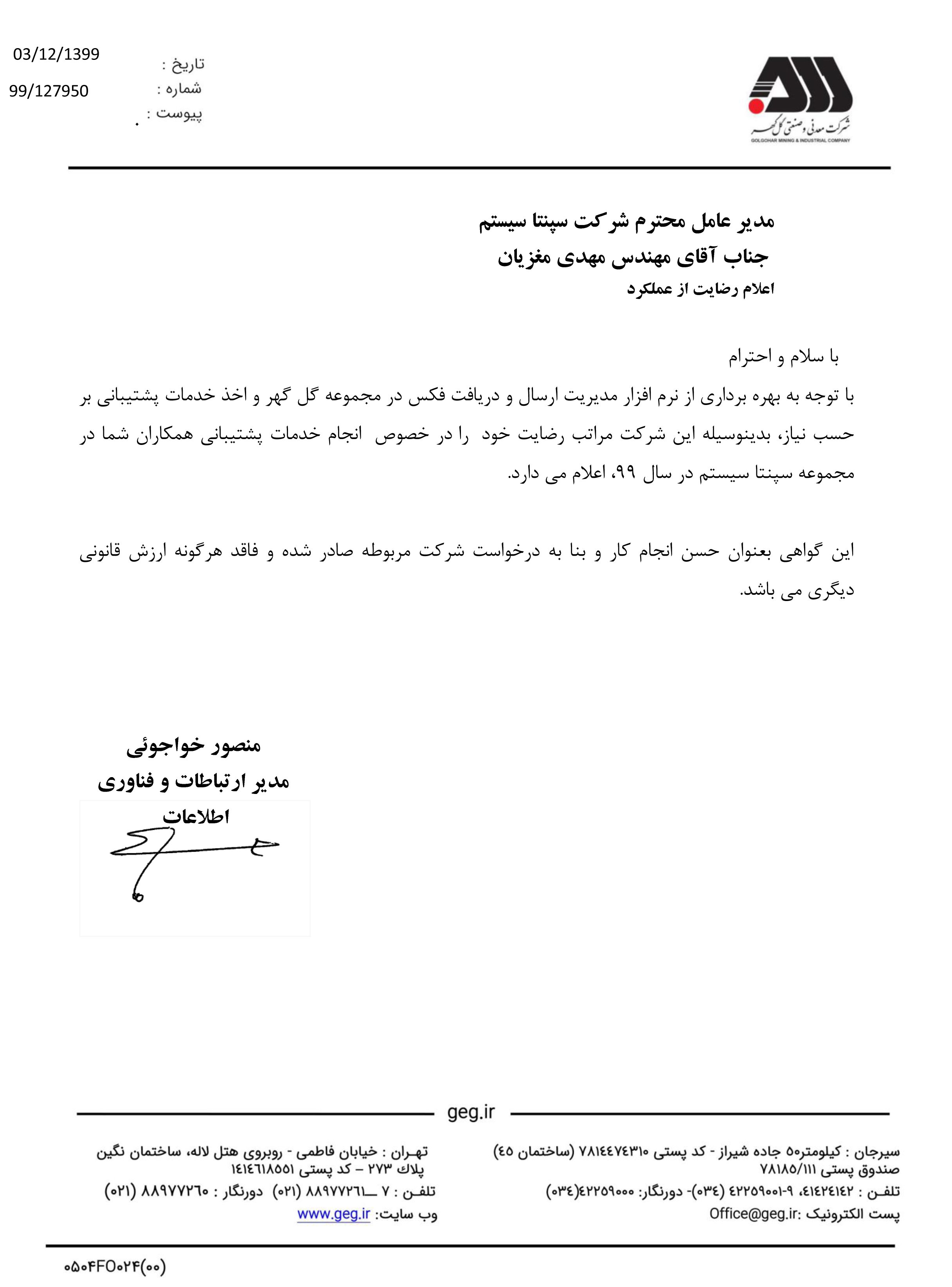اعلا م رضایت شرکت معدنی و صنعتی گل گهر از سامانه فکس پیشرفته سپنتا