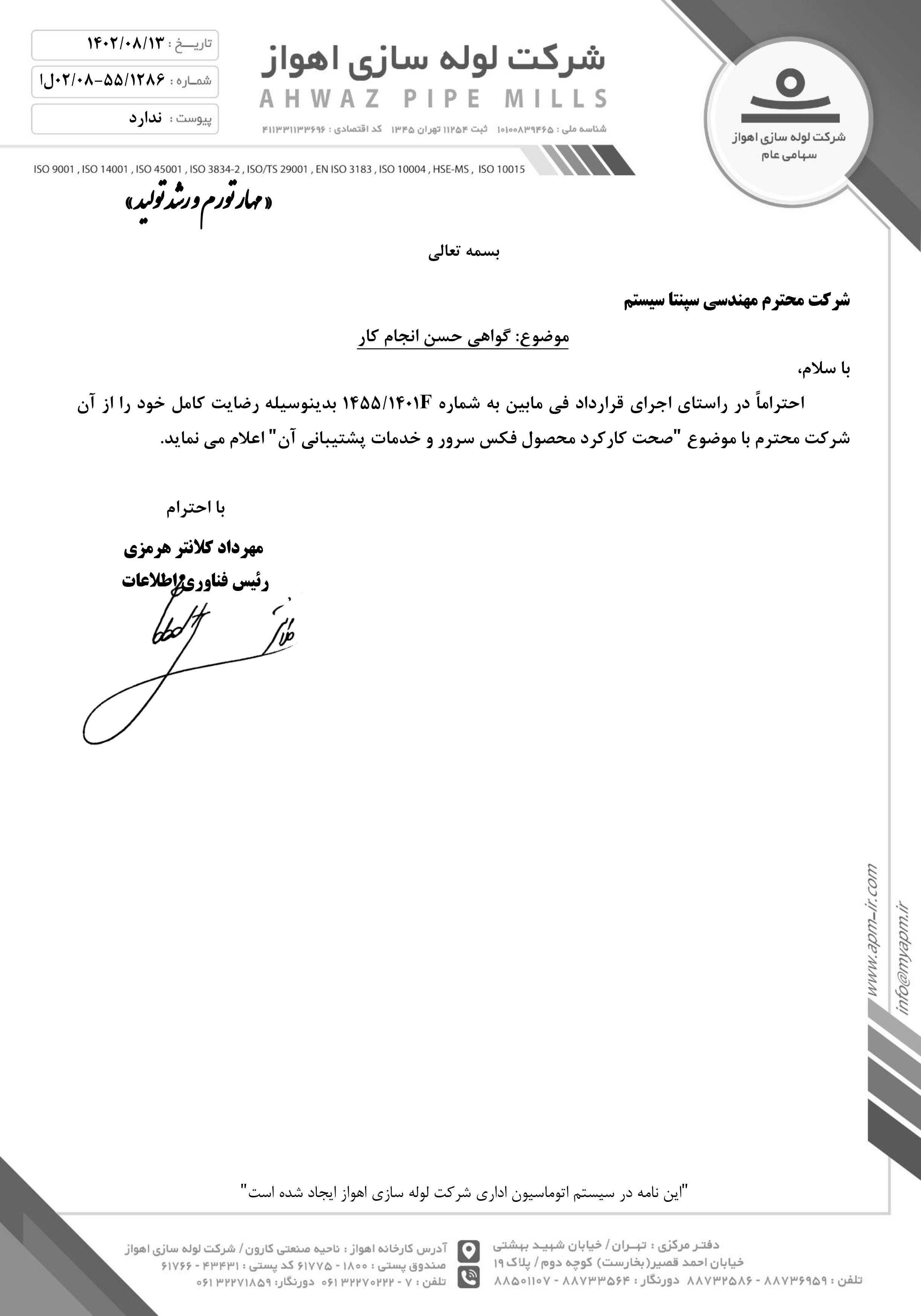 رضايت شرکت لوله سازی اهواز از عملكرد و پشتيباني سامانه فكس پيشرفته سپنتا