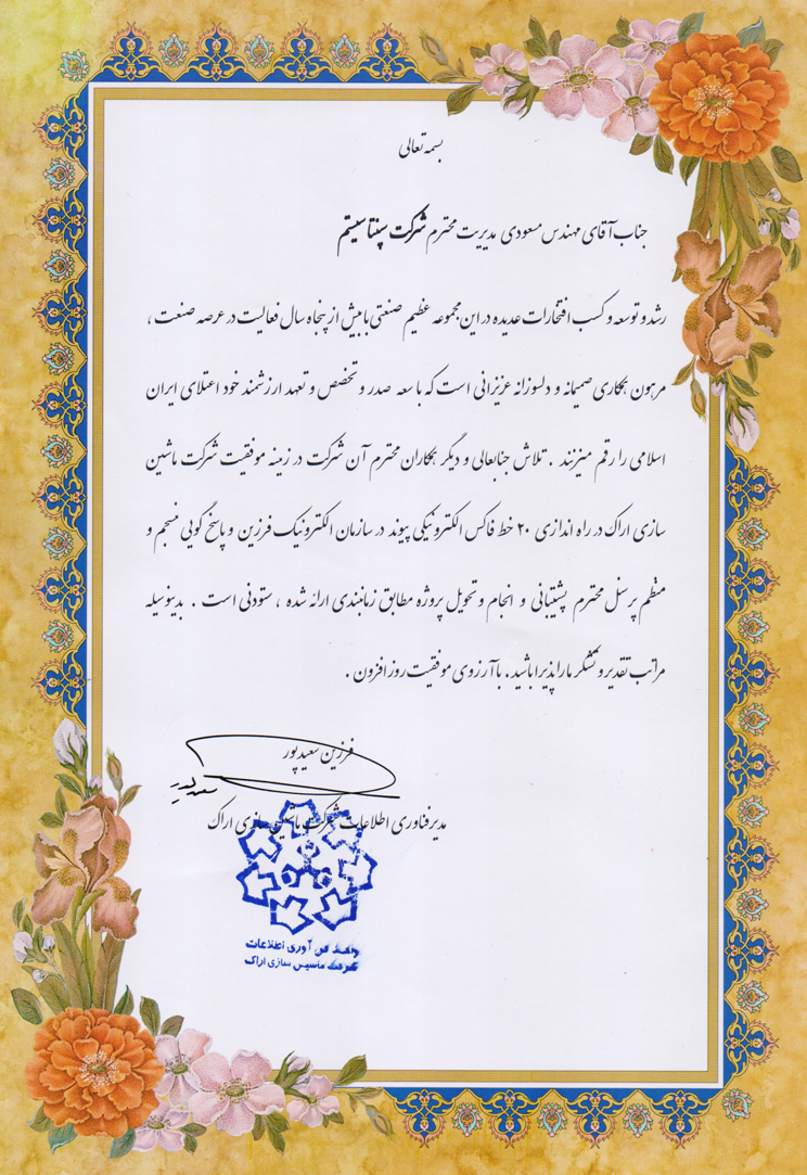 تقدیر نامه - ماشین سازی اراک ، فکس پیشرفته سپنتا