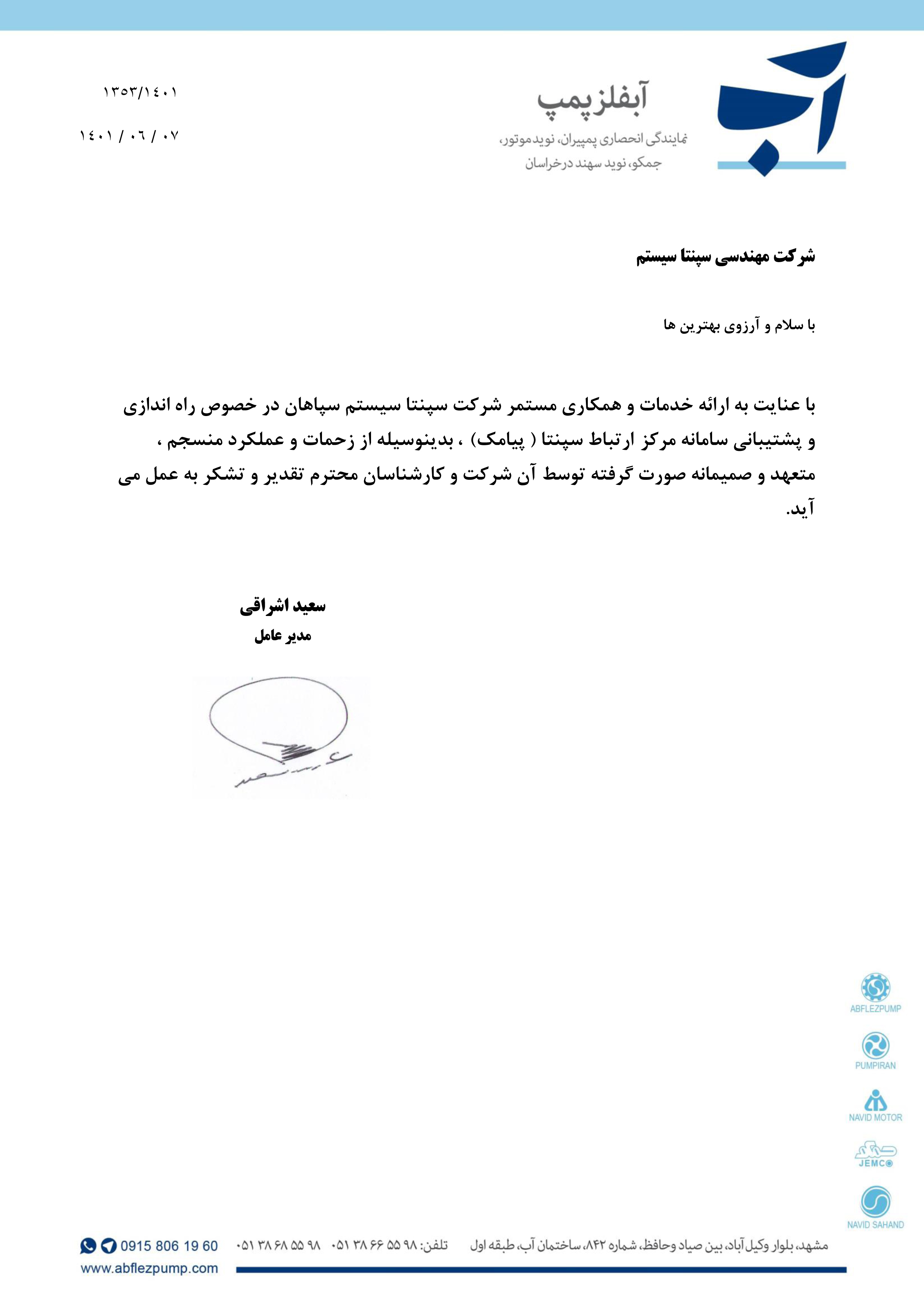 اعلام رضايت شركت آب فلز پمپ از سامانه مركز ارتباط سپنتا (پيامك) و خدمات پشتيباني