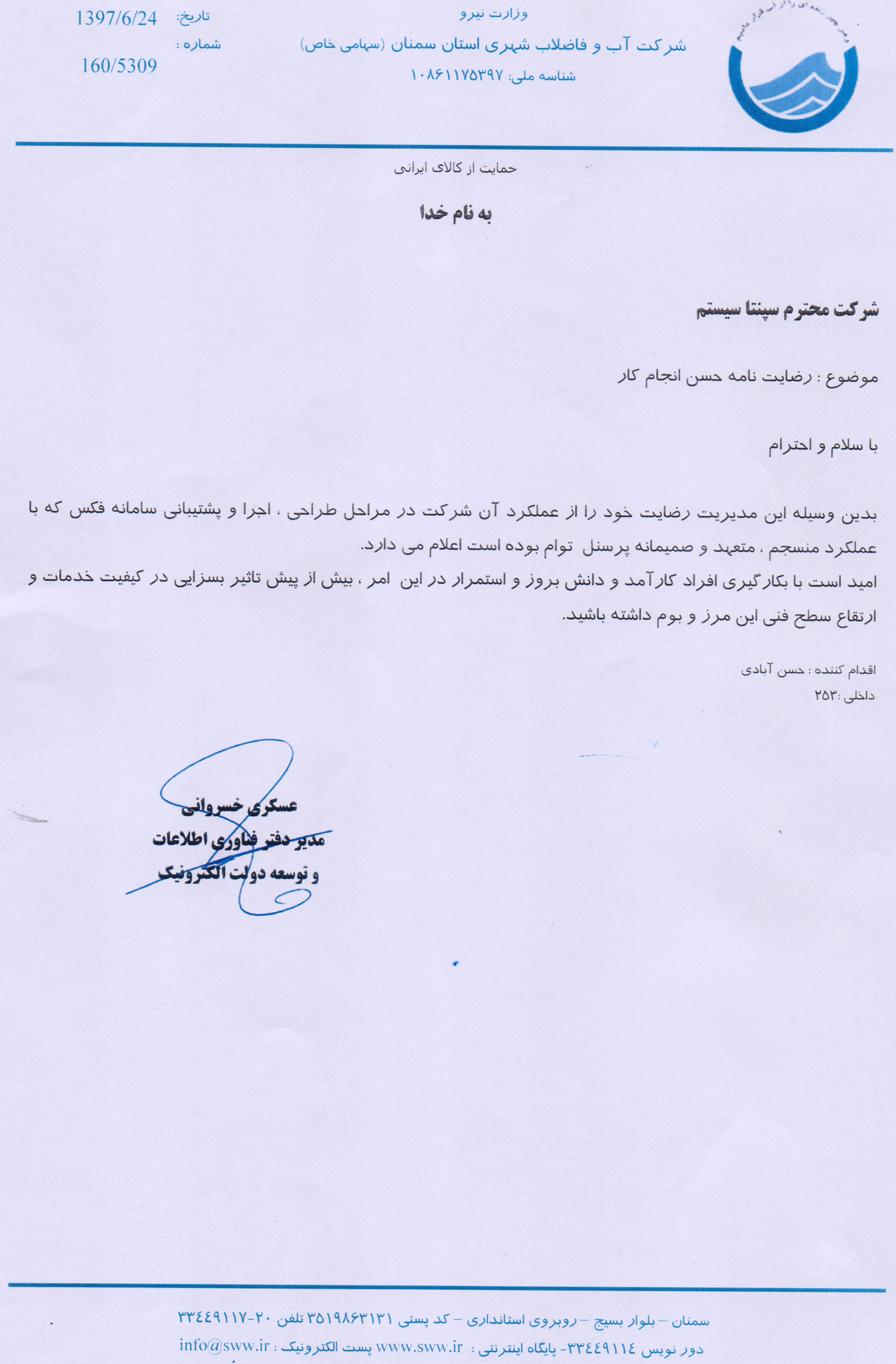 اعلام رضایت شرکت سهامی آب منطقه ای سمنان از عملکرد نرم افزار فکس الکترونیک سپنتا