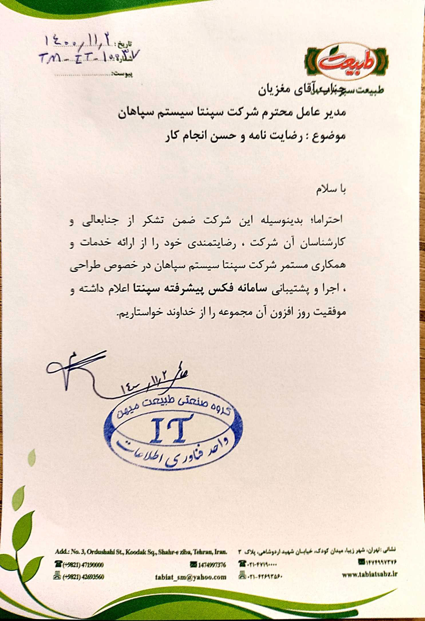 اعلام رضایت گروه صنعتی طبیعت میهن از سامانه فکس پیشرفته و تحت وب سپنتا