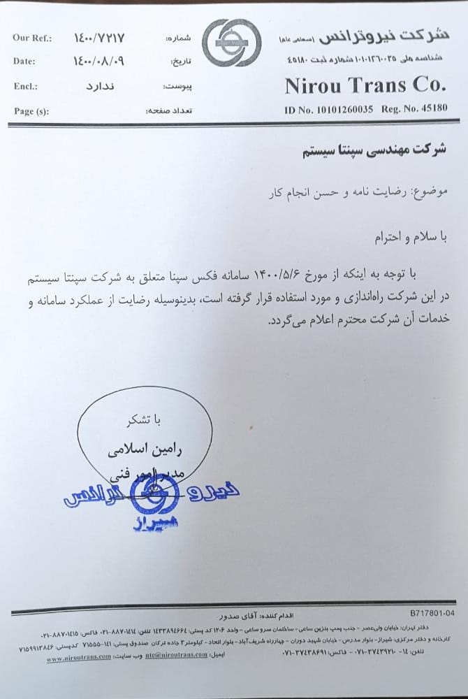 اعلا م رضایت شرکت نیرو ترانس از سامانه فکس پیشرفته سپنتا